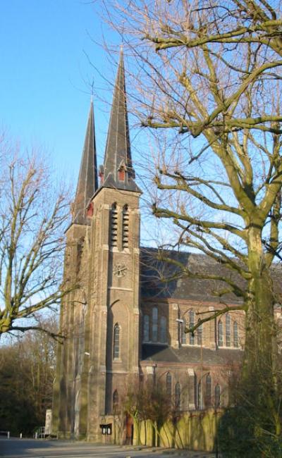 In 1873 the Marquise of Courtebourne-de Nédonchel had a Lourdes grotto built in the gardens of her château at Slotendries. People from Ghent and other nearby locations asked to be allowed to visit the grotto and pray there, and it was claimed that in 1875 Pieter De Rudderwas miraculously healed of a compound fracture.To accommodate the resulting increase in the number of pilgrims, a neo-Gothic church based on plans by E. Van Hoecke-Peeters (slightly modified by J. B. Bethune) was completed in 1876 and consecrated in 1877. It was entrusted to the Jesuits, to which the Marquis's late son had belonged. In one of the towers there is a carillon made up of 49 bells, cast by the Michiels Foundries in the 1950s. The keyboard was temporarily removed during renovation works in the 1970s but has not yet been replaced to this date.