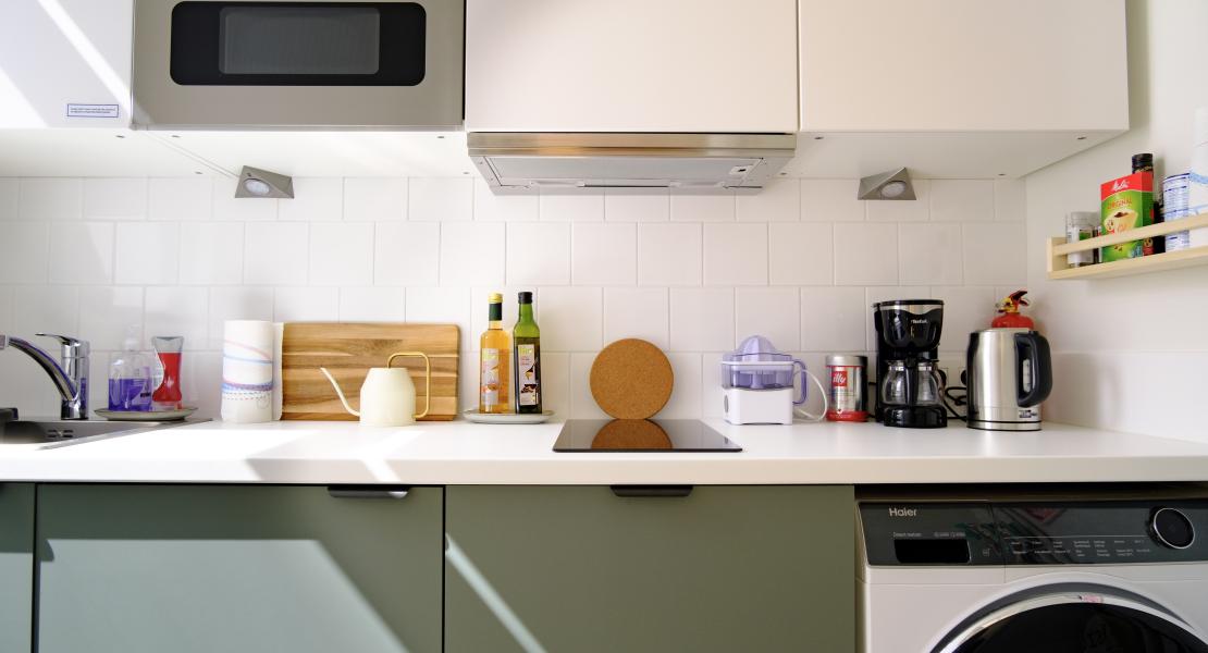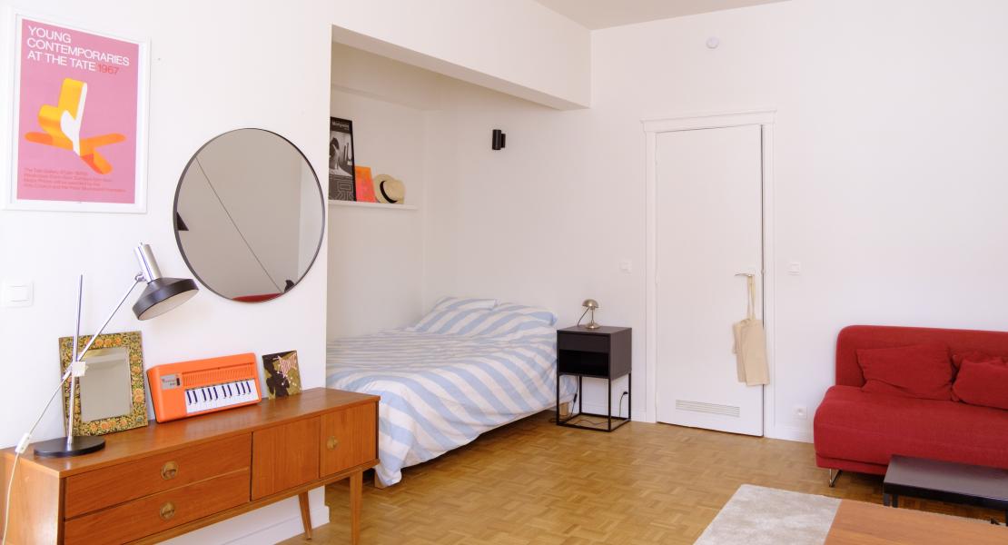 The furnished studio consists of a large and bright room and a small bedroom area, with a double bed (140x200), a comfy sofa, dinner table and desk, a modern shower room with toilet, plenty of storage space, an equipped kitchen (induction hob, microwave, fridge , filter coffee maker, kettle, toaster, and all the necessary kitchen utensils). A washing machine is also available. No oven, no AC, no space inside to store for bicycle.