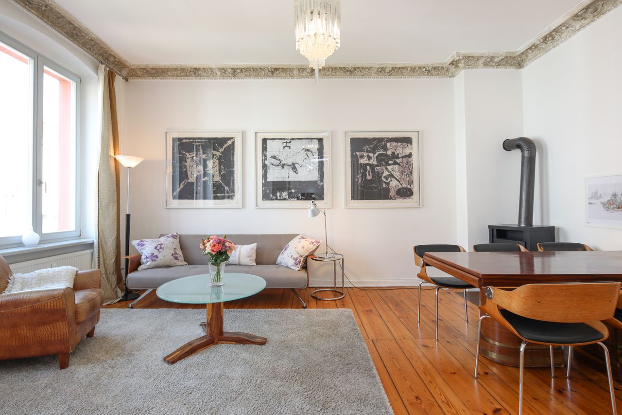 Beautiful modern and sunny one bedroom apartment with stucco ceilings in Brussels, in a perfect mix of designer furniture, retro and design antiques.