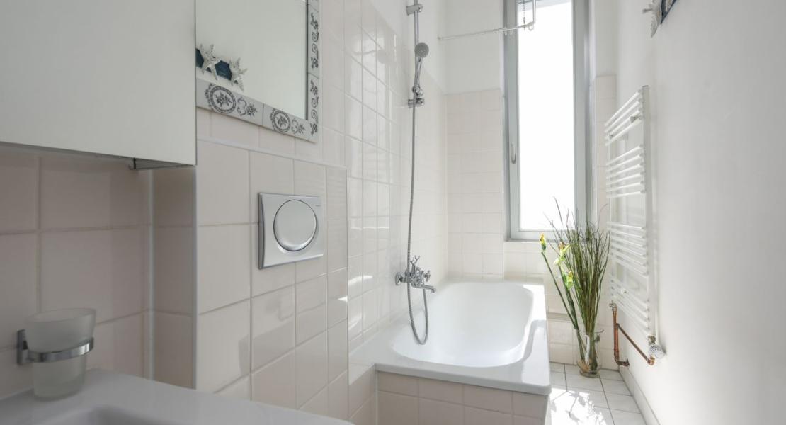 The living - dining room is furnished with a sofa bed, comfortable leather armchair, coffee table, flat screen TV and a wonderful spacious wooden table with 4 chairs. The antique stove is left for decoration after the renovation work in the apartment. Through the large double doors you reach the working and reading room with a desk chair. The bedroom is furnished with double bed 180x200, 2 bedside tables with reading lamps and a spacious wardrobe. The windows here can be darkened.