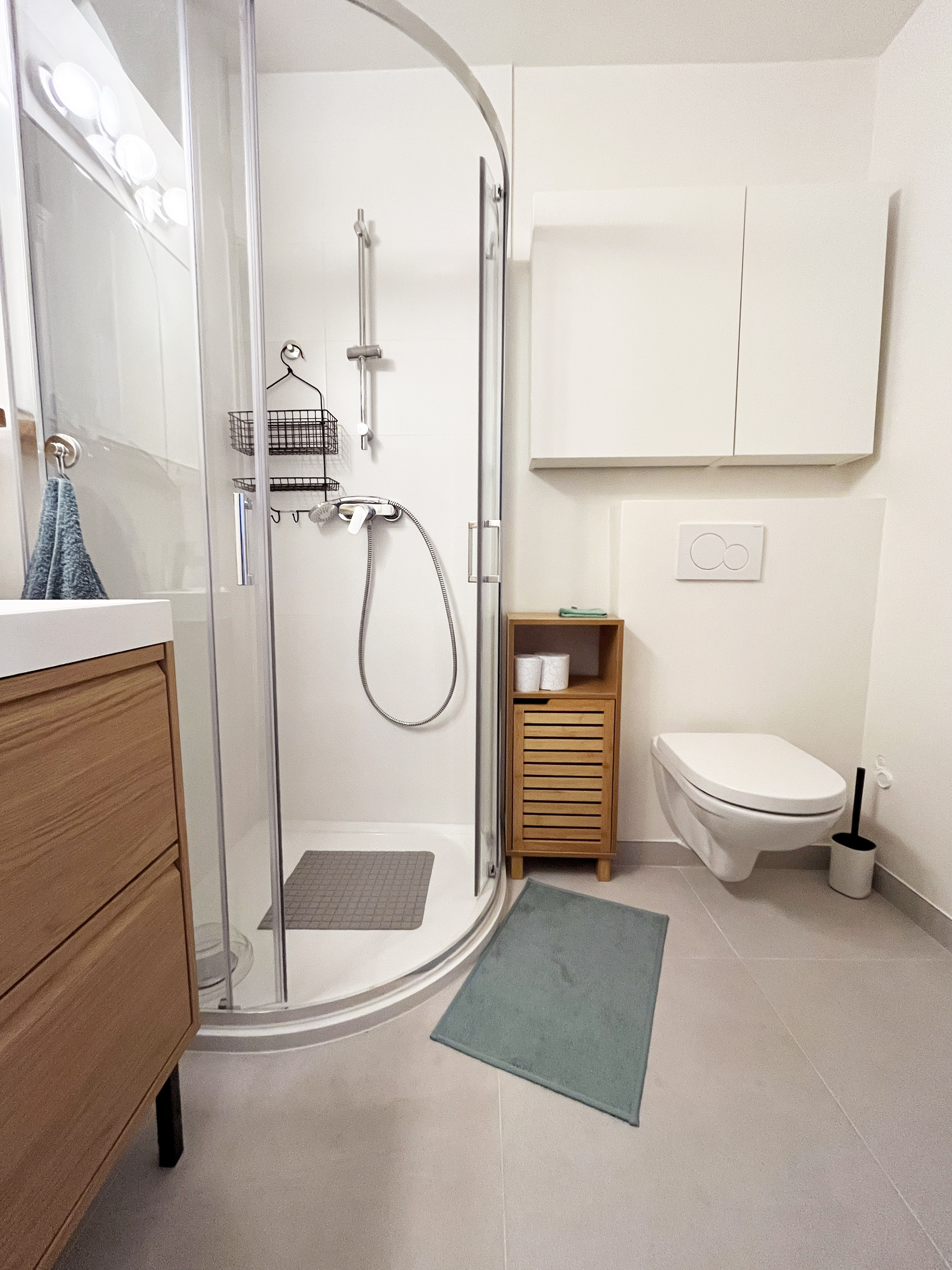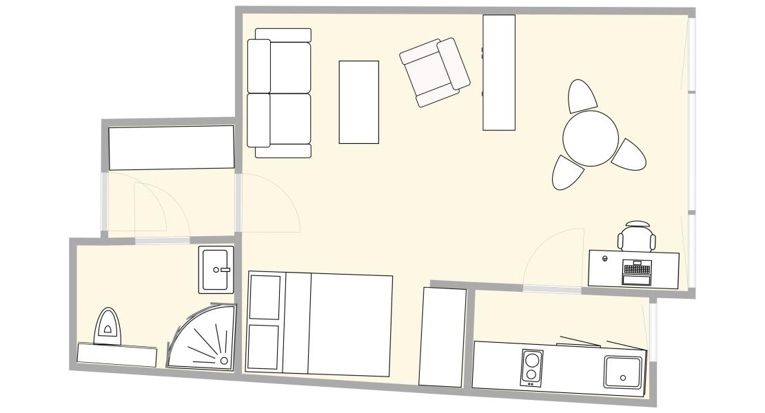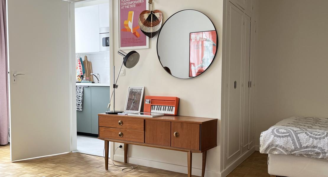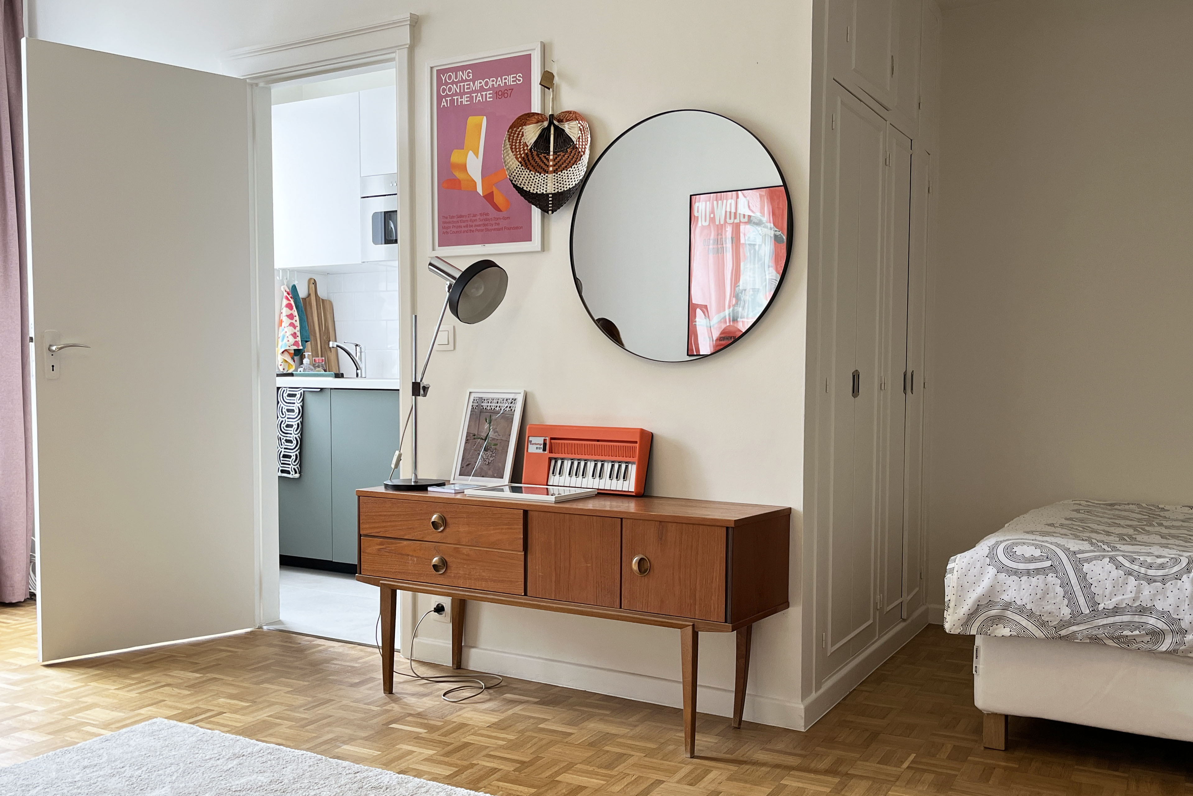 The furnished studio consists of a large and bright room and a small bedroom area, with a double bed (140x200), a comfy sofa, dinner table and desk, a modern shower room with toilet, plenty of storage space, an equipped kitchen (induction hob, microwave, fridge , filter coffee maker, kettle, toaster, and all the necessary kitchen utensils). A washing machine is also available. No oven, no AC, no space inside to store for bicycle.